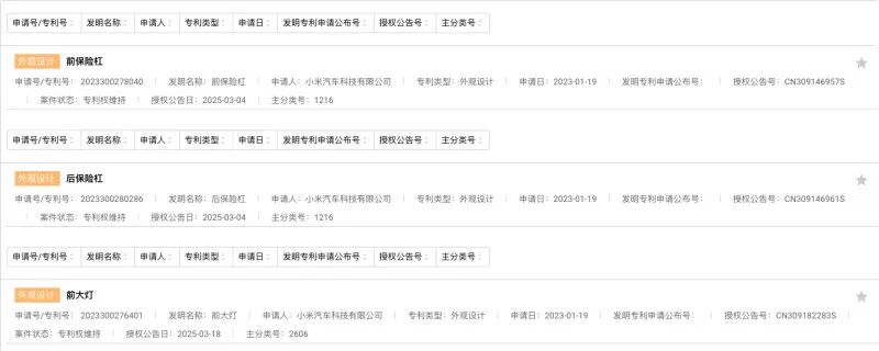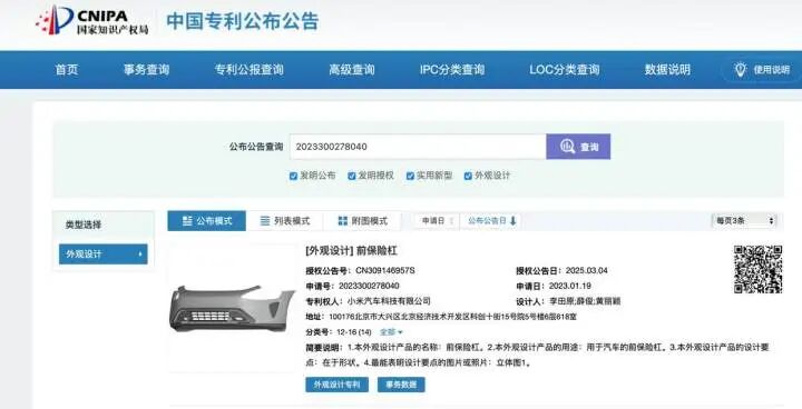 据多家媒体此前报说念,燕鲁新动力曾对小米汽车三件外不雅筹画专利拿起无效宣告请求,三件专利区分是——后保障杠(央求号/专利号2023300280286)、前保障杠(央求号/专利号2023300278040)、前大灯(央求号/专利号2023300276401)。有媒体对比专利图纸与小米汽车实车外不雅后,称这三项筹画均为小米SU7、YU7车型的中枢外不雅特征。按摄影关历程,该专利无效宣告案件将于3月26日上昼进行现场口审。